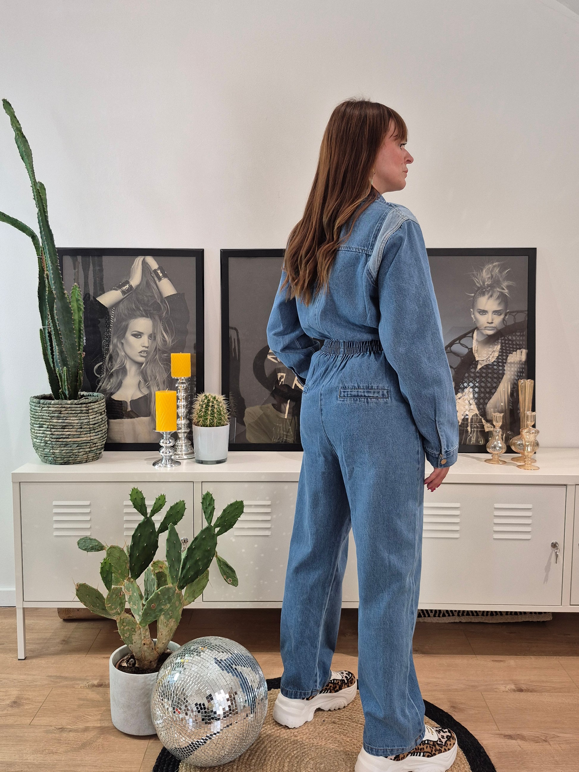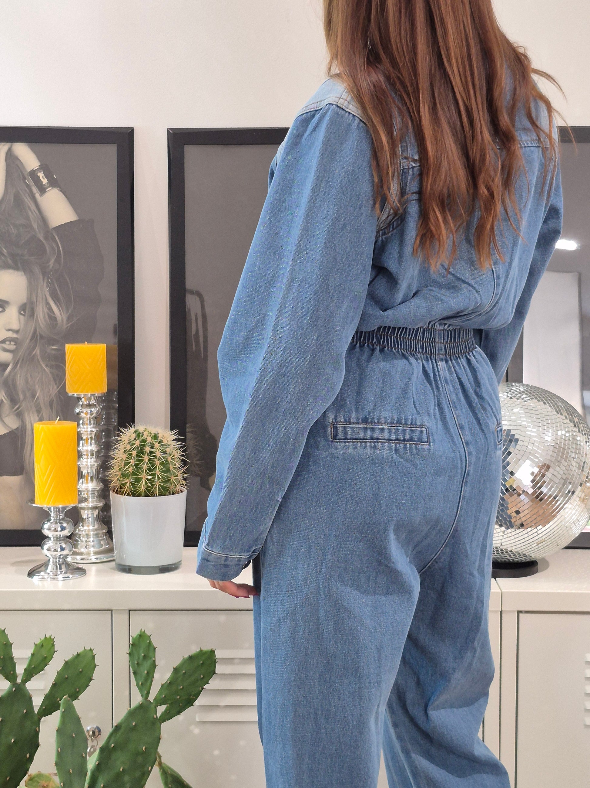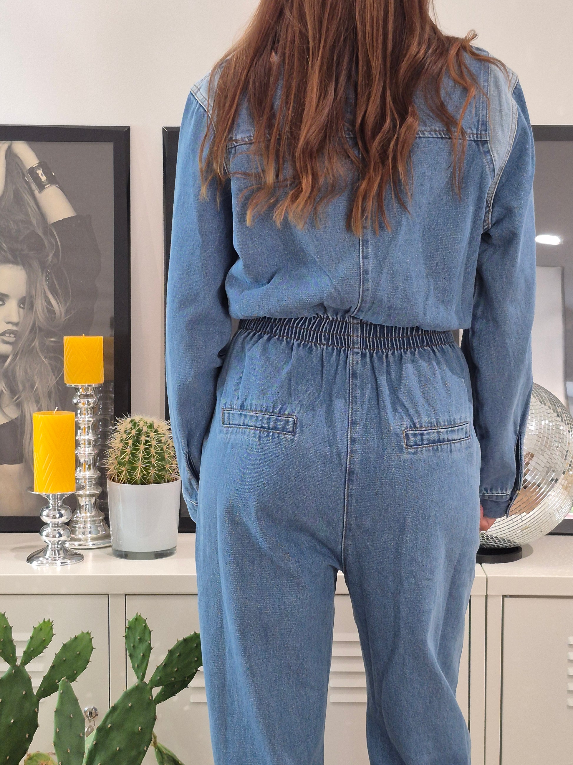 - Combinaison en jeans à ceinture élastique et tirette métallique | Détail jeans clair au niveau des épaules