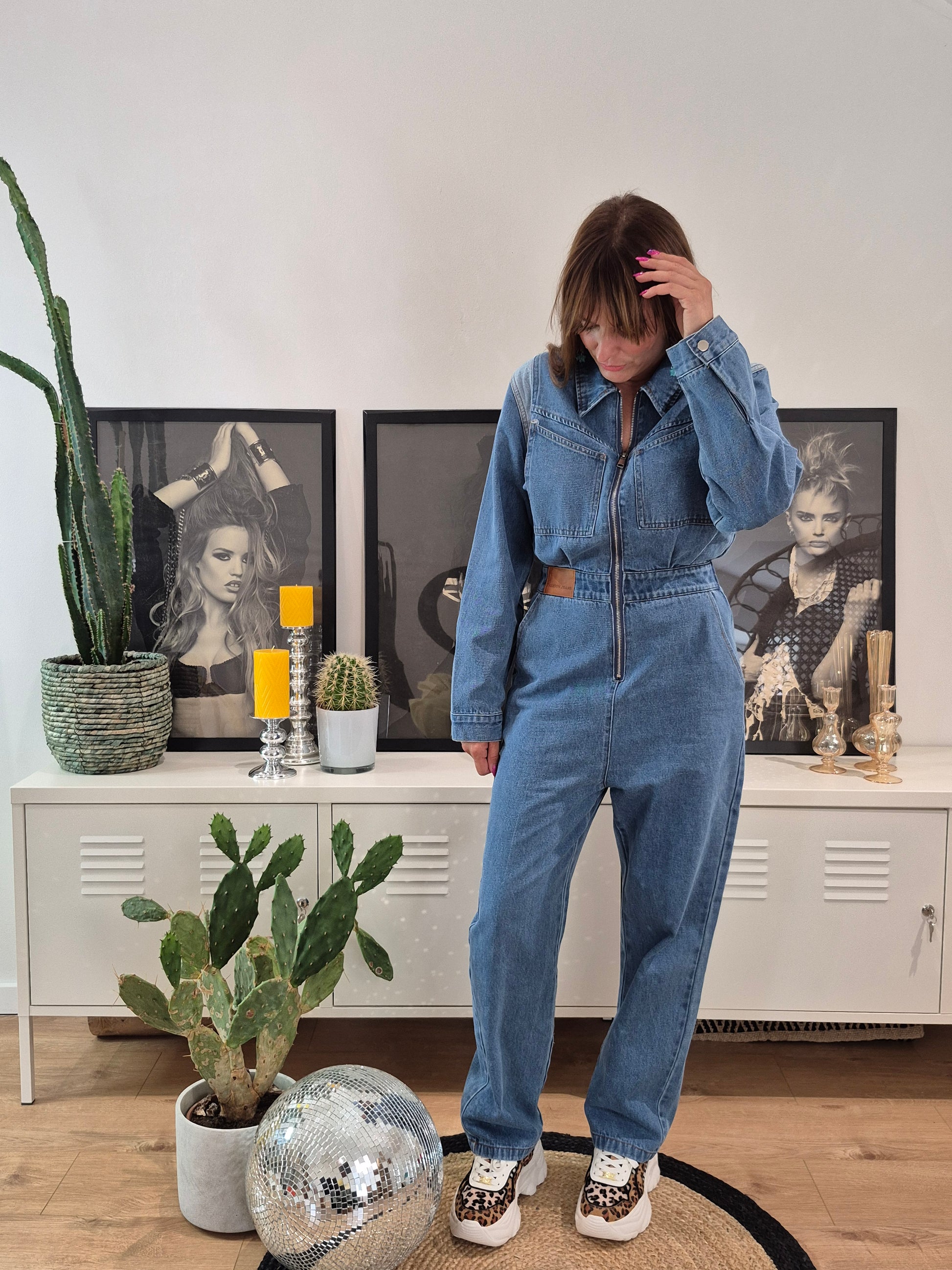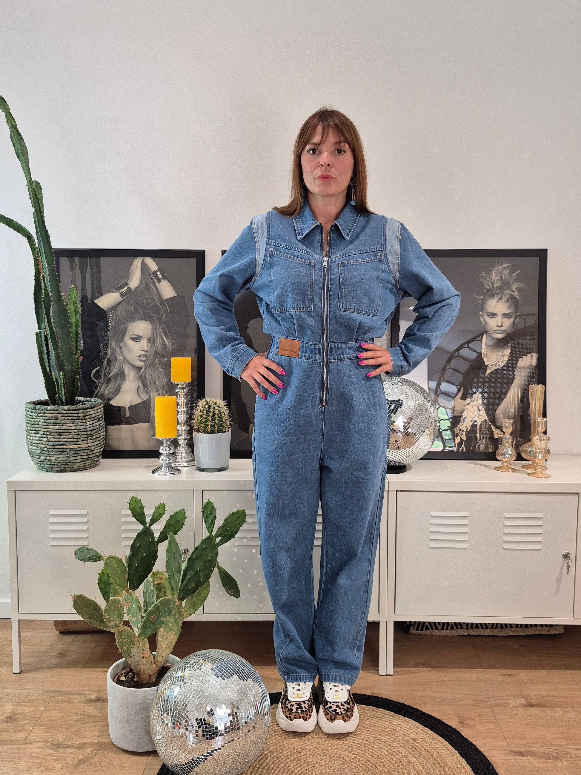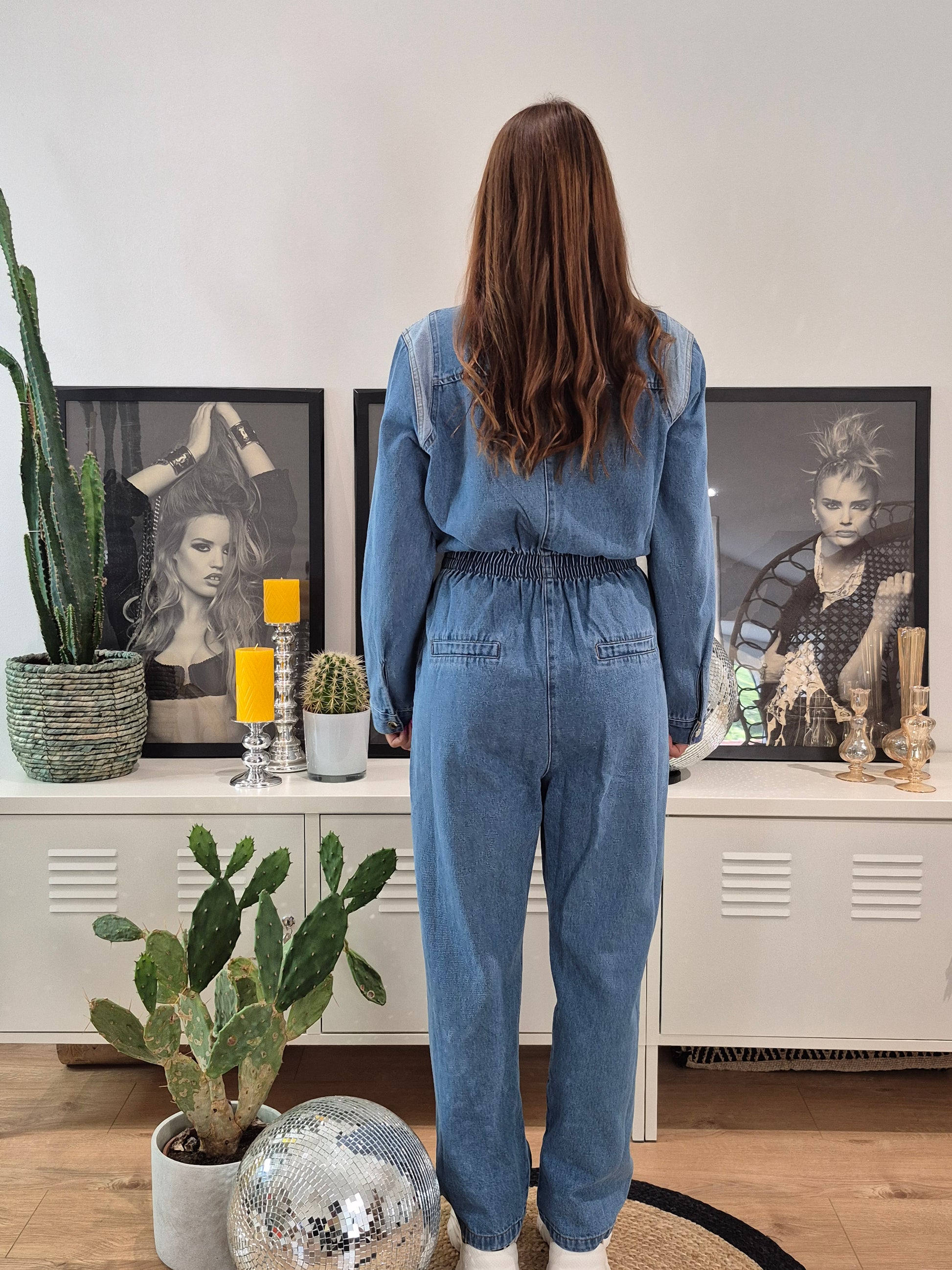 - Combinaison en jeans à ceinture élastique et tirette métallique | Détail jeans clair au niveau des épaules