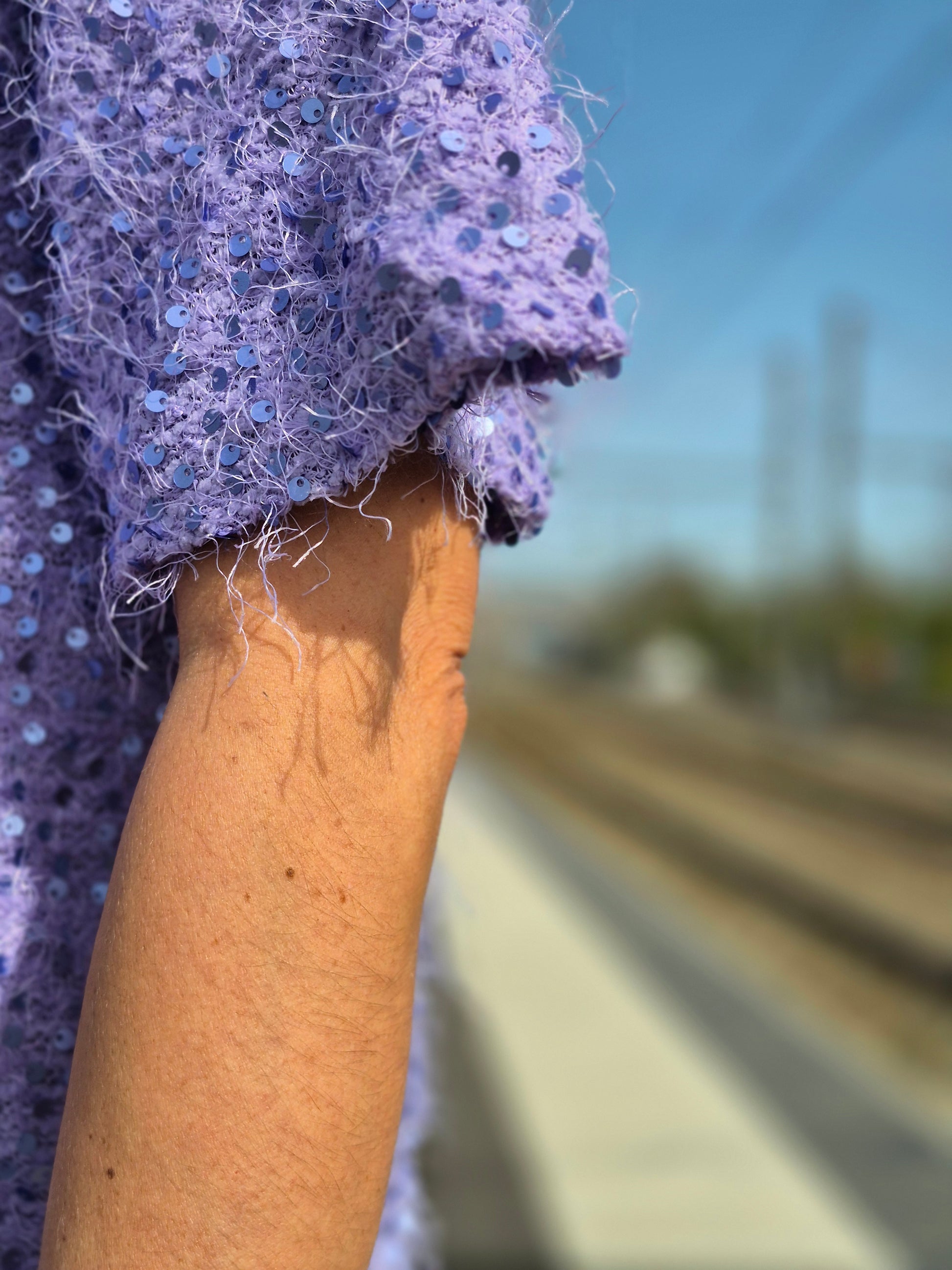 - Robe droite à manches courtes / Fils de tissus effet fluffy / Recouverte de sequins violets